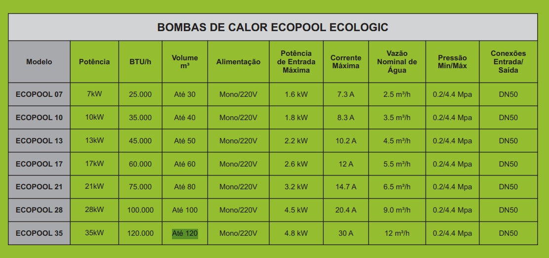 A linha ECOPOOL ULTRA–INVERTER da Ecologic foi projetada para oferecer a máxima eficiência energética, com um coeficiente de performance (COP) de até 16. Isso significa que, para cada 1 kW de energia elétrica consumida pela máquina, ela é capaz de gerar até 16 kW de energia térmica, aquecendo sua piscina de forma rápida, econômica e sustentável.